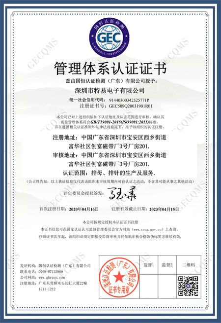 祝深圳市特易電子有限公司在創思維驗廠網輔導下順利通過ISO9001管理體系認證