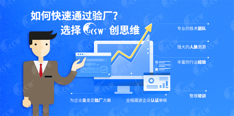創思維專業從事客戶驗廠、認證、咨詢輔導,價格公道,服務優良,“咨詢+輔導+考勤”一站式服務保姆式輔導,全方位實時跟蹤,多年來成功幫助上萬家企業順利通過驗廠,在行業中有口皆碑!