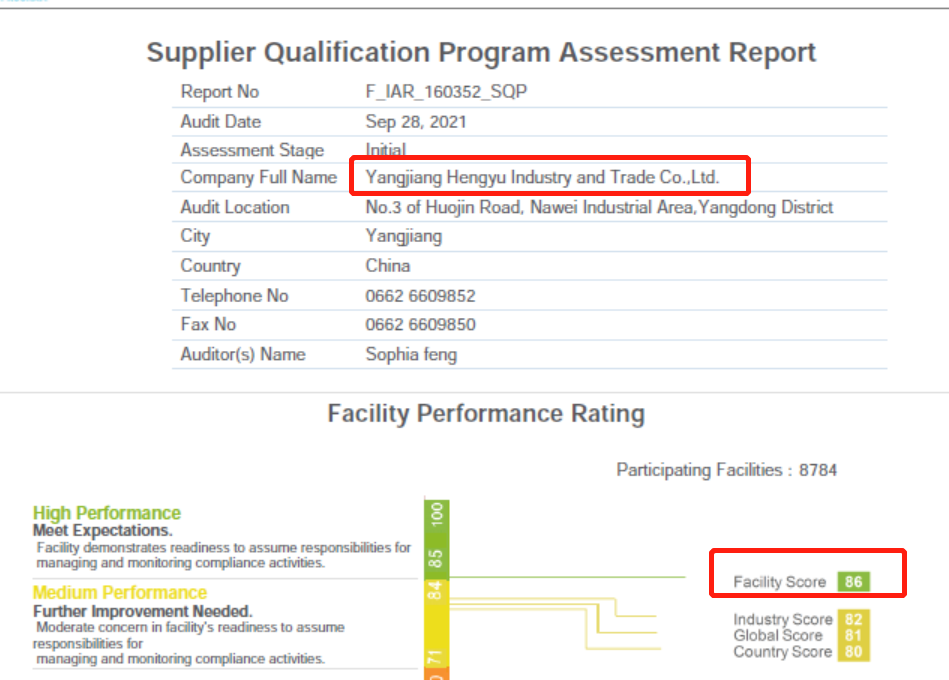 祝陽江恒裕工貿(mào)有限公司通過WCA/SQP驗廠,并取得WCA最高等級綠燈86分