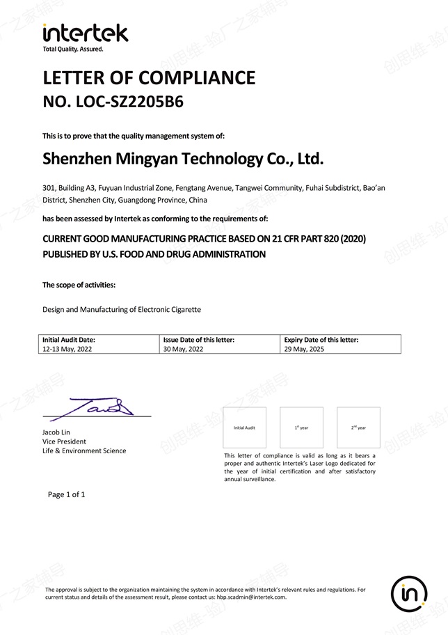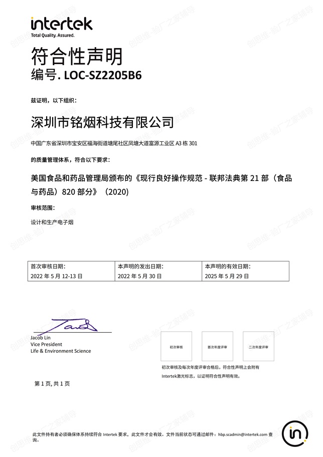 2022年5月12-13日,國際認證機構INTERTEK(ITS) 專家及深圳市創(chuàng)思維企業(yè)管理技術有限公司技術經理、GMP輔導老師一起,對深圳銘煙電子煙、電子霧化器生產基地、煙油灌裝車間、包裝車間、成品倉庫、更衣室、化學品倉等進行了GMP 820認證現場檢查。經過2天嚴格、細致的檢查,順利通過檢查,并取得GMP-820認證證書。